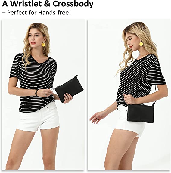 • Exterior measures: 8.7"(W) x 5.4"(H) x 0.15"(D). 2 Straps: 1 removable 7.5" wrist strap, 1 removable cross body shoulder strap adjustable from 30 to 55 inches. Could be used as a wristlet or a crossbody purse while traveling. Note: this purse is not intended for large amounts of items (There may be a slight error in size).